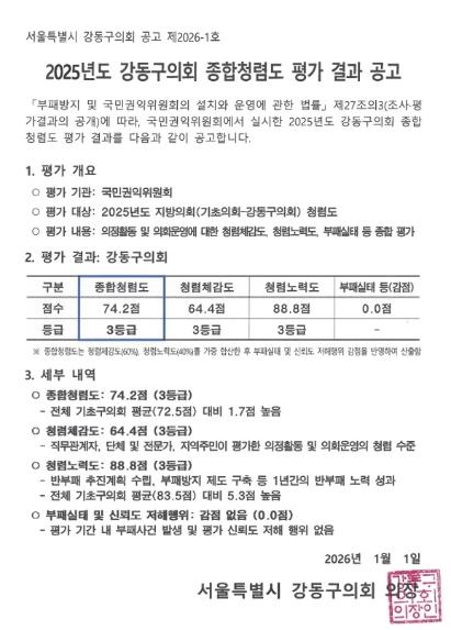 | 2025년도 강동구의회 종합청렴도 평가 결과 공고 | |||||